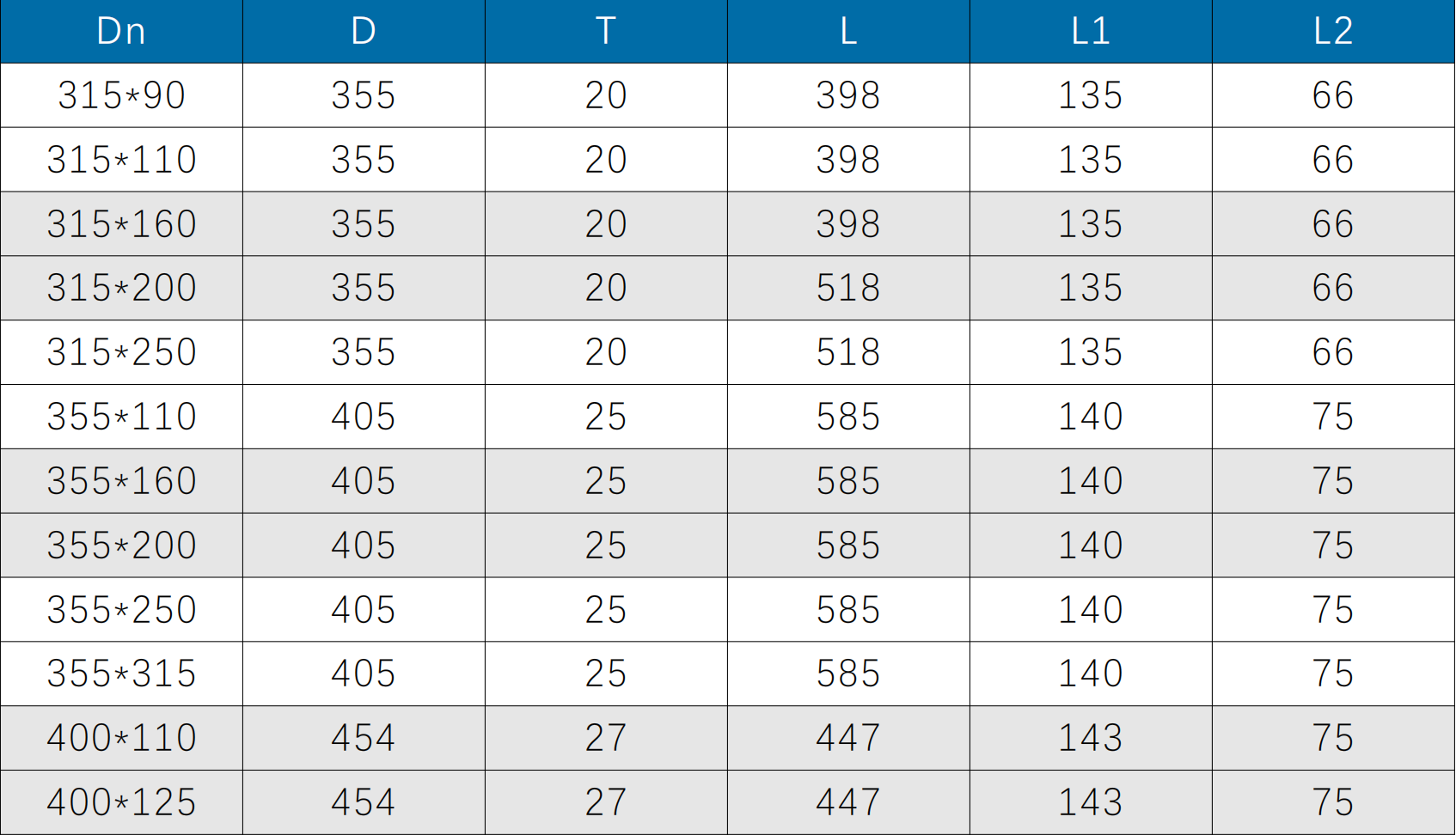 FX Series electrofusion reducing tees are made of PE100 high-density polyethylene raw material, with a size range from 63 mm to 315 mm and a pressure rating of PN16.